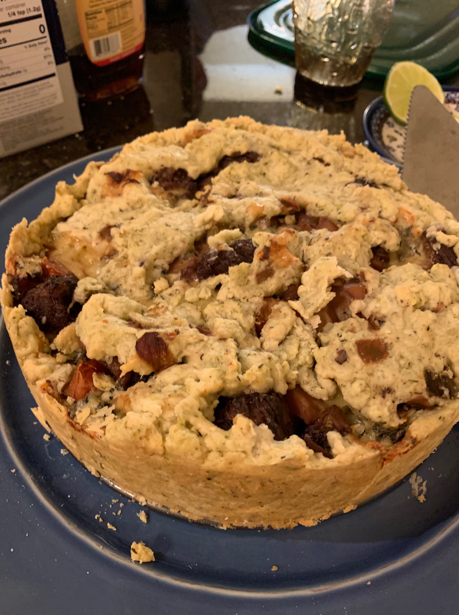 For this attempt, I decided to make a traditional pie with allover crust that would need to hold its own. Where I think I went wrong was that I didn’t have the dough quite right. I believe I didn’t convert one of the metric readings properly, and when I tried to course correct it might have been too late. So it wasn’t a pretty pie but it was a tasty one. I mean…Stilton Cheese in the crust? How could you go wrong!?!?!? And the bottom held even with the hefty amount of steak and onions in the center! So here’s to small victories.