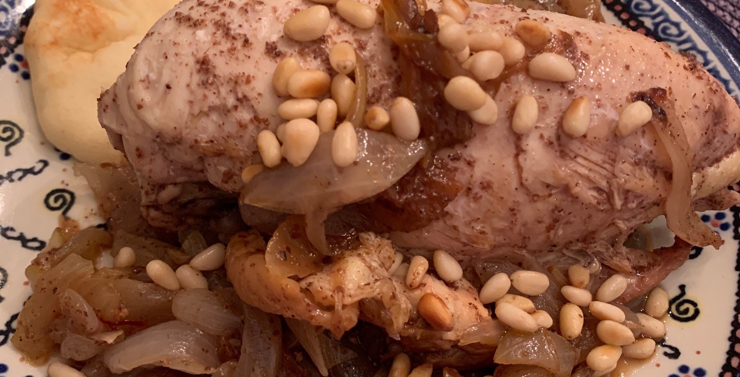 First up for the new year is the country of Palestine, where I chose to make something called Musakhan. This chicken dish is incredibly simple but is made special by the use of a large amount of sumac. I’d seen sumac in recipes previously and I know it is one of the ingredients in the Za’tar spice blend I discovered last year, but on its own it is best described as a little sweet and sour and reminiscent of lemon juice but in a powder form. While some may be familiar with the poisonous plant sumac, this is related but its red berries (as opposed to the white of the poisonous cousin) is safe to eat. (Matt will probably freak out when he realizes this fact-I did not try to poison him!!!). In addition to sumac, it boasts a very slow cooked batch of onions that cook down slowly to form a beautiful base to cook the chicken on. The recipe called for chicken legs, but I opted for bone-in chicken breast. Served with pine nuts and naan, this was a easy, light way to kick off the New Year of cooking!