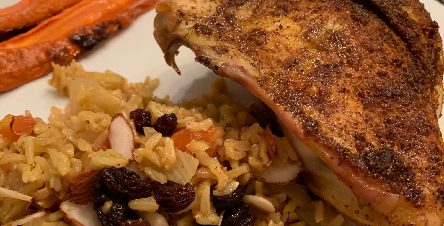 Representing Yemen, Chicken Mandi is typically cooked under the ground over hot coals for several hours. Given I don’t have many hours (much less a place to put a whole in the ground) I elected to make this flavorful chicken dish from the comfort of my kitchen on a Monday night. Bone-in chicken is ideal here (I opted for split chicken breasts) as it keeps the chicken very moist. The Yemeni spice blend suggested in the recipe below was wonderful (I would suggest cutting it by 1/4 for just this recipe) and that paired with a sweet and slightly spice rice (thanks to raisins and green chili peppers) made this a great weeknight meal. Of the various riffs on rice I’ve made as part of this project, this one was a bit less spicy but the inclusion of sliced almonds, tomatoes and onions (along with the raisins and peppers) made it unique. I’m going to add this dish near the top of an ever growing list of chicken and rice combos I’ve cooked as part of this project.
