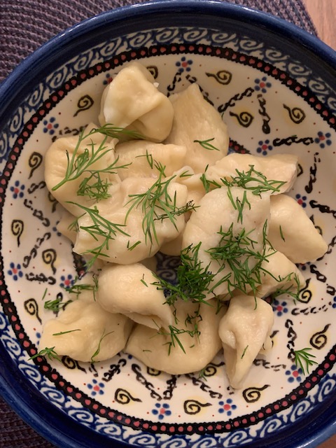 My experience in working with dough has been a bit limited and usually centered on doughs that do not require yeast or any sort of rise. Yes, they tend to be kneaded and sit out for a bit, but they don’t always see a rise (and I think in many of those instances, that is perfectly ok). This dough seemed to be in that same family. It reminded me of a empanada dough in its toughness (which is good since it holds a meat filling, albeit a small amount). Yet when it cooked (a simple 5 minute boil) it transformed into a pasta-like consistency. The recipe indicated that this should make 50-60 (!!!) little dumplings but I ended up with around 35. I lost a little steam along the way and some of the pieces of the dough (once I cut out 2 1/2 inch circles) didn’t really roll back out in the same way to make more. From what I’ve read, it’s tradition to make dozens and dozens of these at a time and to freeze them up for use whenever you need. But this was the perfect amount for the two of us paired with some soup and vegetables. These dumplings are filled with ground pork and onion and I served them in white vinegar and dill.