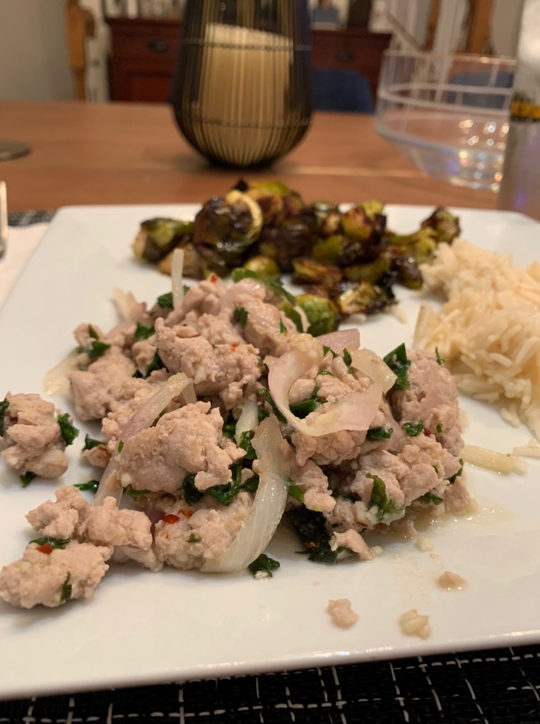 Here’s the recipe I used: https://thewoksoflife.com/pork-larb/. I also made these Asian-style Brussel Sprouts and they were awesome: https://www.slenderkitchen.com/recipe/crispy-asian-brussel-sprouts (I suggest cutting the sauce by about half).