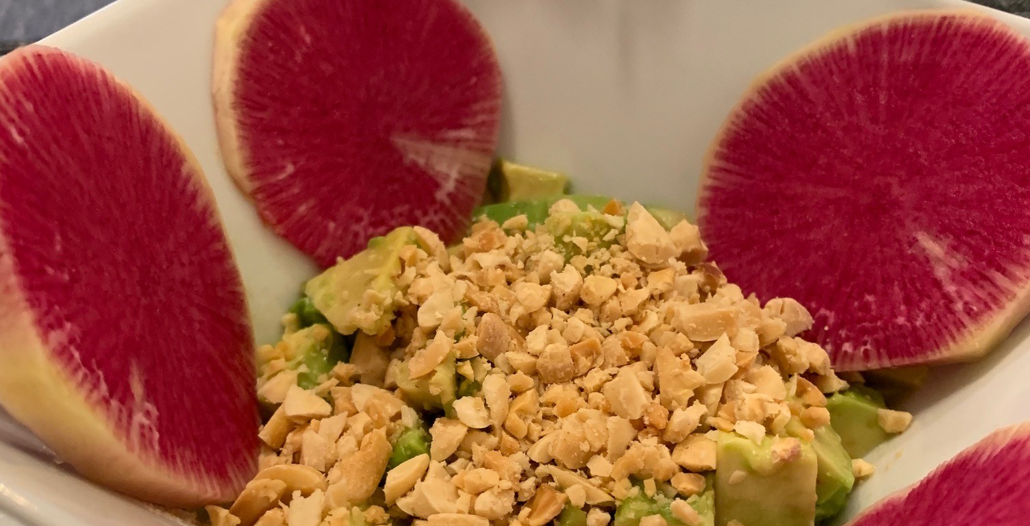 This is by far the simplest of all the recipes I’ve made in the past year and a half and as such, I am going to make this a very simple blog post. Love avocado? Make this. Don’t have an aversion to peanuts? Definitely make this. Slaai is a dip that consists of cubed avocado, grated ginger, lemon juice, and crushed peanuts and hails from Swaziland in southern Africa. I served it with sliced watermelon radishes because I had them on hand and they are beautiful, but I think any kind of crudite or pita chip will do. The creaminess of the avocado with that crunch of the peanut did all of things for my tastebuds. It’s a little different but a lot delicious.