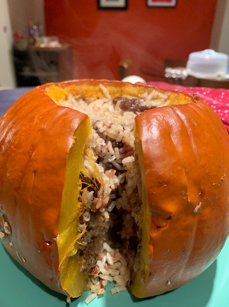 Additional Notes: For the prep of this, you do need to allow some time to dig out the seeds and guts of the pumpkin, just as if you were getting ready to carve a pumpkin for Halloween. As the recipe called for, I used a 2 1/2-3 lb pumpkin and followed the quantities for rice. This was a bit much for two people and the leftovers were ok the next day, but the pumpkin lost a bit of its luster. So invite some friends over and enjoy this fresh out of the oven.