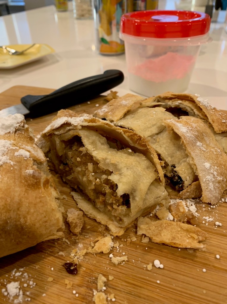 One of my favorite fall desserts is an apple pie and I didn’t get one this year, but I made up for that void with a new type of apple dessert (at least for me) . . . the famed apple strudel. I elected to follow a recipe for an Austrian apple strudel though I think the general gist is the same whether its German or Austrian. I was a bit worried about making the dough as I haven’t had the best luck with rolling out a thin dough without it breaking. But it must have been my lucky day because not only was this dough pretty malleable, it didn’t really break, even when loaded down with sliced apples (that could have been thinner), sugared breadcrumbs, and rum soaked raisins. The end result was a crispy shell wrapped around rolls of flavor. I brought it this to a friend’s “Thanksgiving dessert party” this past weekend and so glad I did. This wasn’t the simplest of recipes and did require some patience but I think for this time of year, that is to be expected and perhaps a bit celebrated!