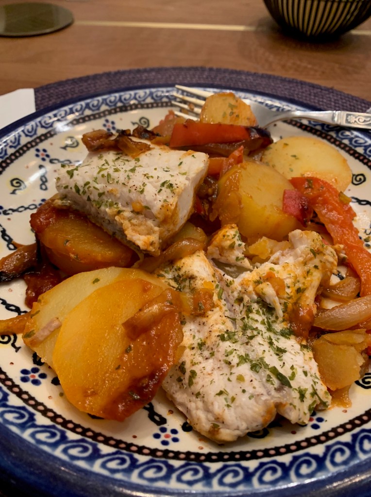 It’s important to know that I took one significant shortcut with this recipe. I didn’t start with a whole fish, nor did I make a fresh fish broth. That was not the level of work I was looking to engage in a few days before Thanksgiving. I elected to use vegetable broth and used catfish filet, cutting into large chunks as instructed. The fish for this almost acts more as a garnish to the flavorful potato filled “stew” that lies beneath. While it is lightly seasoned, it’s what’s underneath that is the real star. It’s chock full of potatoes, tomatoes, onion, white wine and paprika. Submerge the fish in the juices to flavor it.