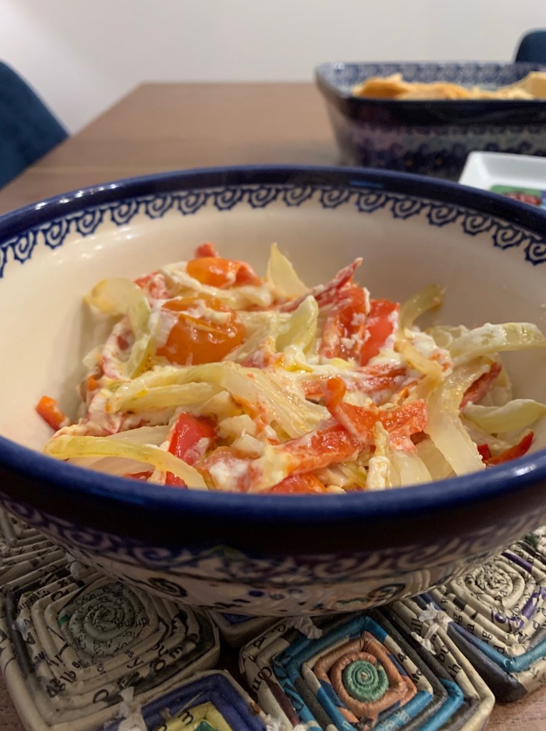 For Bhutan, I ended up going with the National Dish – Ema Datshi. Is it a dip or is it a soup? Depending on the recipes you look up, it could go either way. But I served this as a dip along with pita chips. I was surprised at how mild this dip was given the number of serrano peppers, but the farmers cheese (I used goat) seemed to temper it. This was a nice dip to have for the start of a dinner with visiting family which included some of my favorite African dishes.