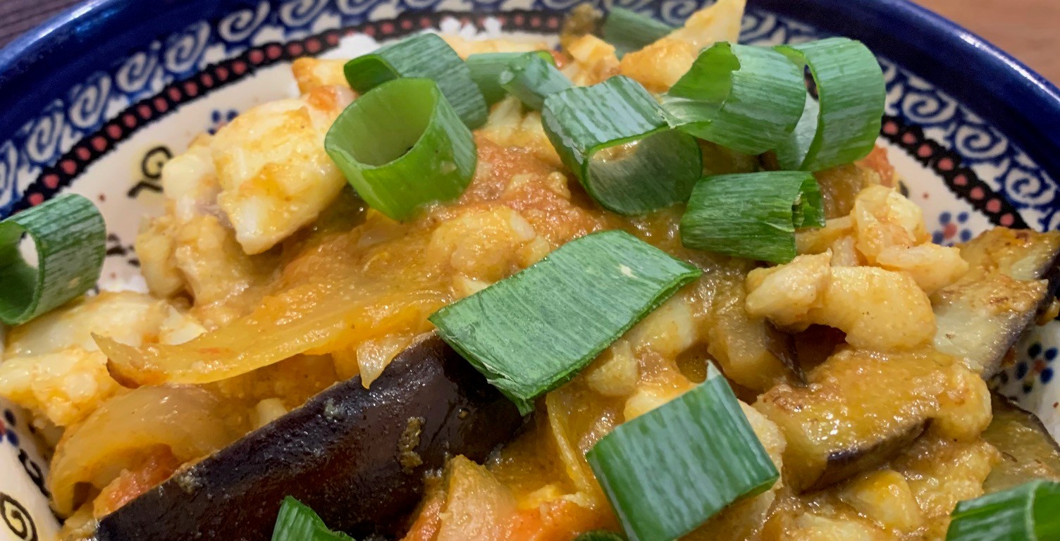 We’re heading into warmer weather here in D.C. but that doesn’t mean I can’t still enjoy a good curry, especially one made with fish! I opted to use cod for this and while the intent was for the fish to stay intact, I found that after the frying portion of the instruction, it just crumbled when added back to the curry. Which in the scheme of things, I think was completely fine as this curry sauce was a perfect bed for the fish, eggplant, tomatoes and onion.