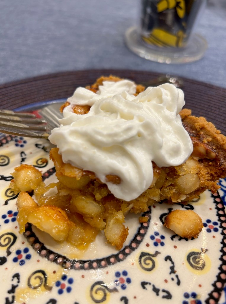 I’ve never quite had a pie like this and I was surprised by how much I liked it. The recipe is pretty straightforward. You lightly cover the base with shredded coconut and then cover it with a mix of chopped macadamia nuts (I liked the look of them halved), brown sugar, egg, honey, coconut milk, and a little bit of melted butter. The final consistency was that of a nutty custard. Top it with a little whipped cream and the end result was divine.