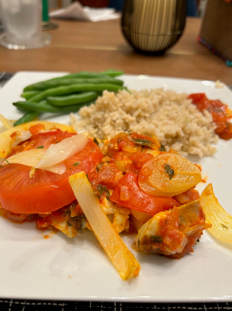 Now back to the “basket.” Even though the paste was relatively thick, I was still worried about ingredients slipping through so once we coated the fish in the paste and layered the onion and tomato on top, we then wrapped it in foil. This basically created a steam pocket and the end result was wonderfully steamed fish (though I was missing the char grilled marks) with little to no mess. This dish was so much more flavorful than I expected and the fish was perfectly cooked.